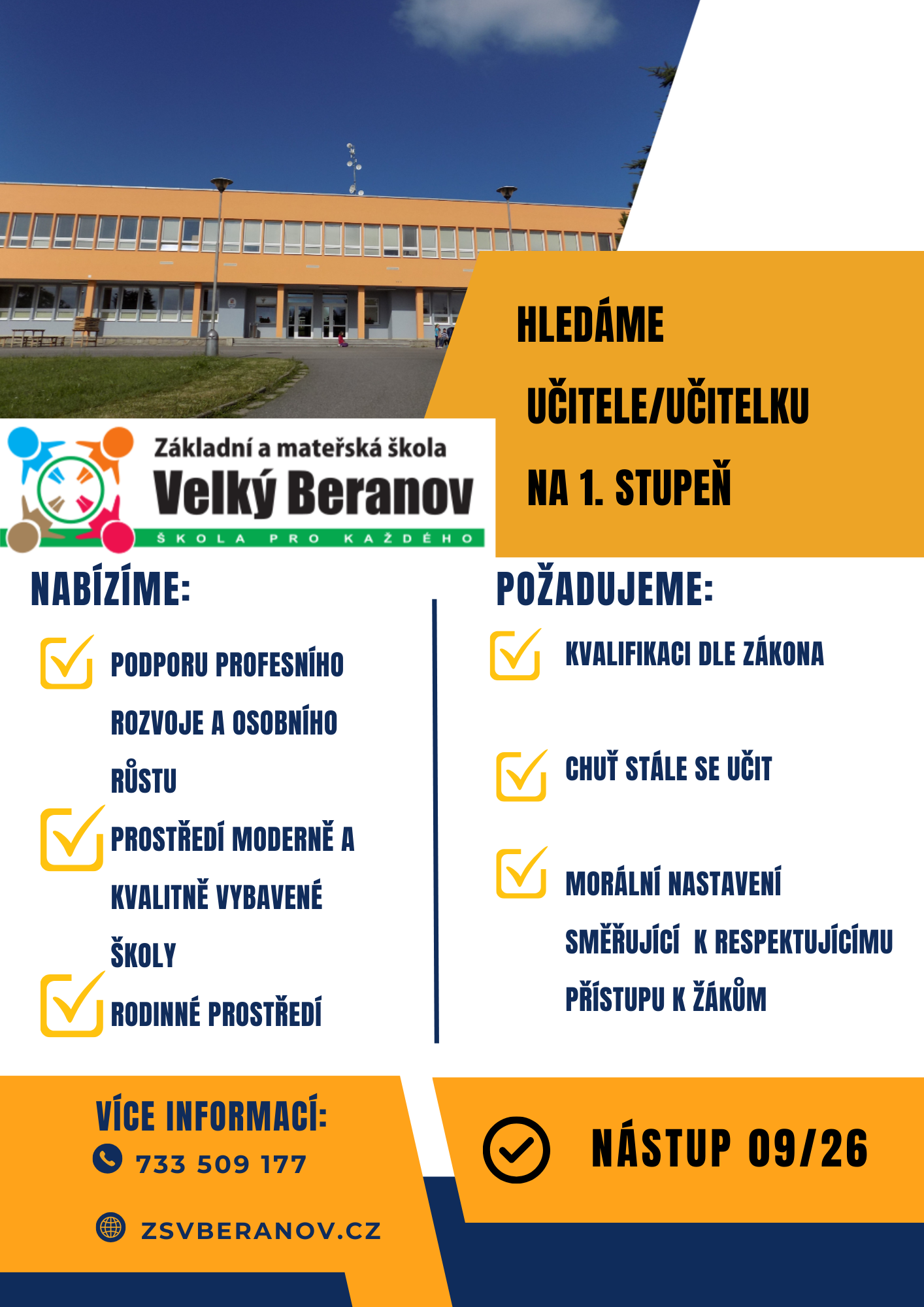 Hledáme učitelku/učitele na 1. stupeň