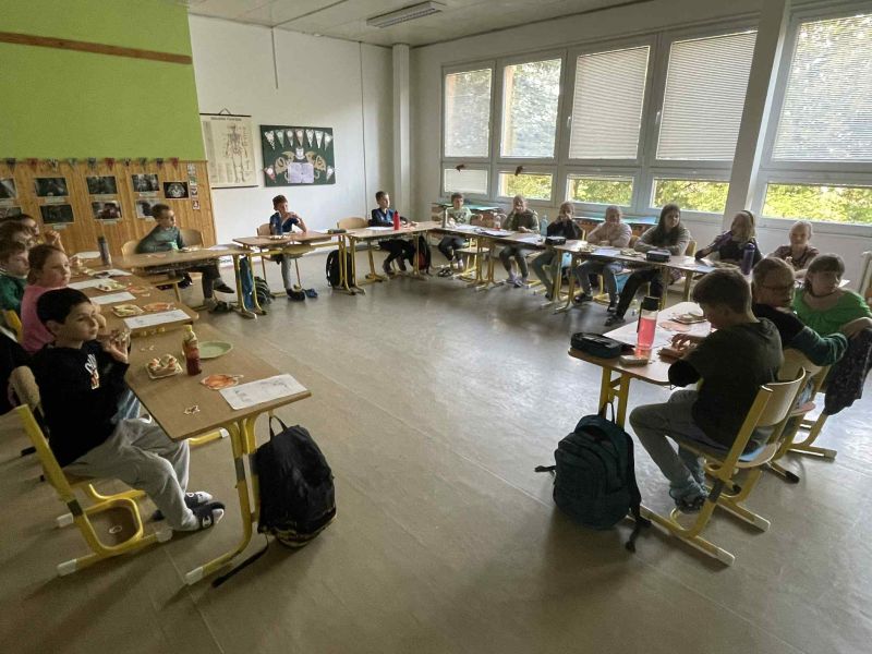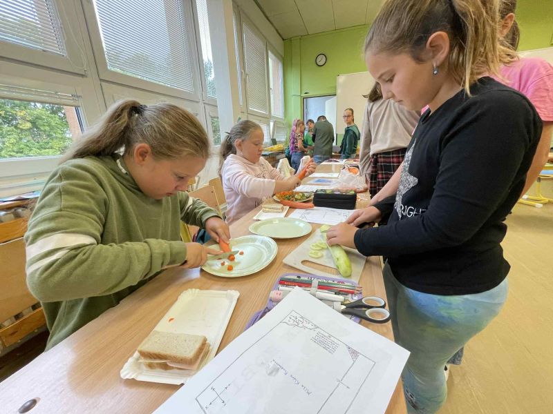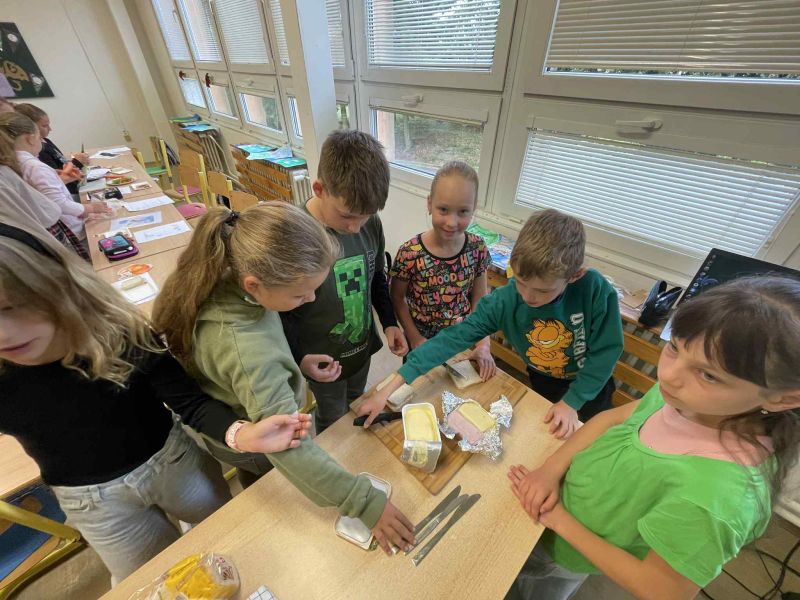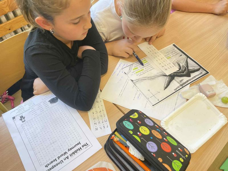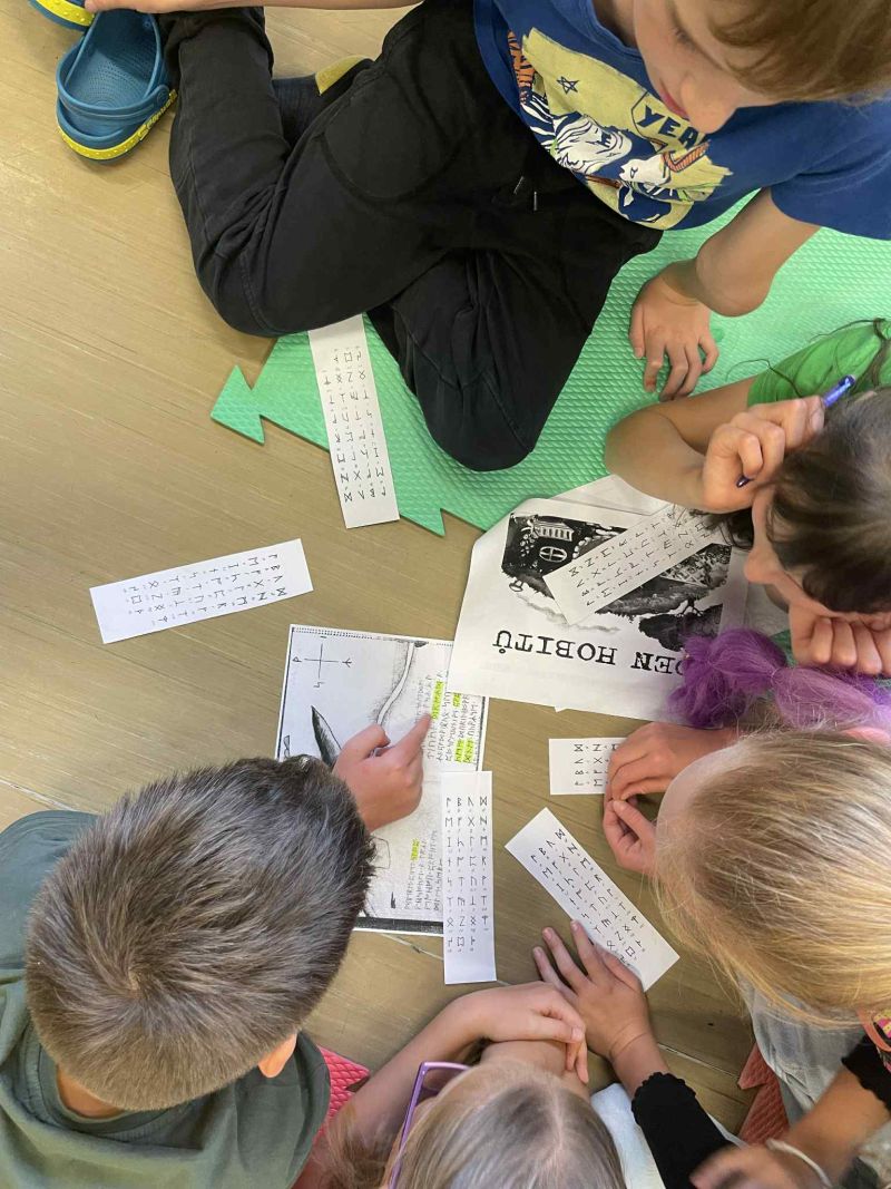 A protože hobiti velice rádi snídají, dokonce dvakrát, tak si čtvrtá třída připravila vydatnou snídani. Každý přiložil ruku k dílu, někdo připravoval sendviče, další krájel zeleninu, jiný zas ovoce. Pak v klidu zasedli a na všem si pochutnali. Po skončení snídaňové hostiny se rozdělili do tří skupin a plnili úkoly s hobití tématikou. Úkoly obsahovaly hádanky, matematické slovní úlohy, osmisměrky v angličtině, práci s textem a kreslení. Všichni spolupracovali a vše zdárně dokončili. Nakonec se pustili do luštění run a překládali text, který uměl přečíst jen Elrond z Roklinky. Každý pak napsal i své jméno runovým písmem. Poslední hodinu všichni nakreslili příbytek Bilba Pytlíka.