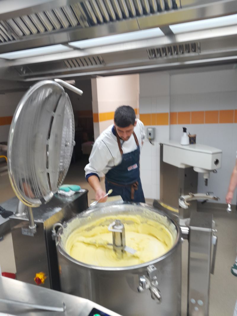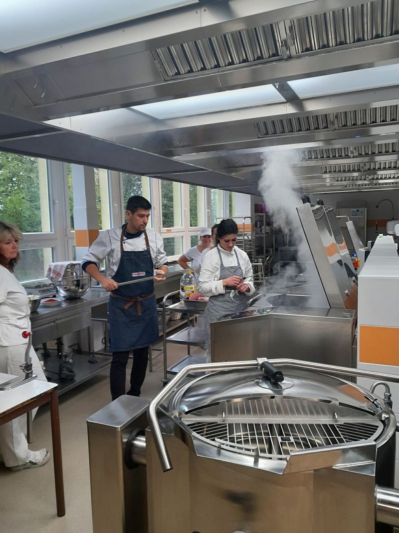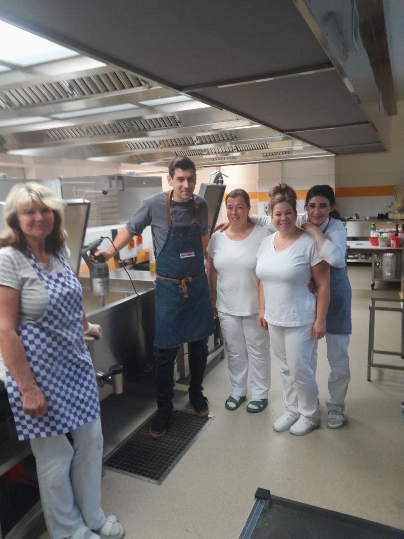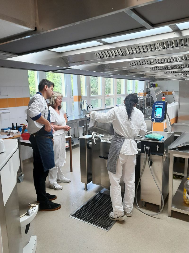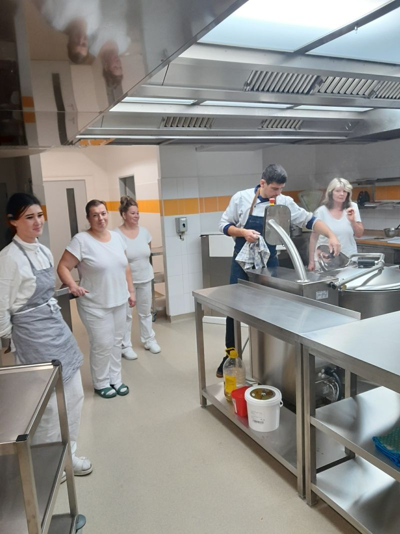 První týden vaření po rozsáhlé rekonstrukci školní kuchyně byl pro paní kuchařky ve znamení učit se vařit a zacházet s moderními spotřebiči. K dispozici jim byl pan kuchař, který je seznámil s novými technologiemi, například noční vaření, obsluha strojů s digitálním displejem a mnoho dalších věcí, které k vaření patří. Během školního roku se na jídelním lístku objeví i mnoho nových receptů, které se budou postupně zařazovat z důvodu změny spotřebního koše. Věříme, že všem strávníkům bude jídlo chutnat a všichni budou spokojeni.